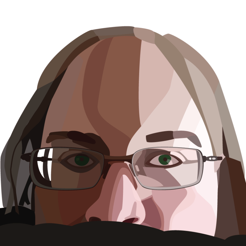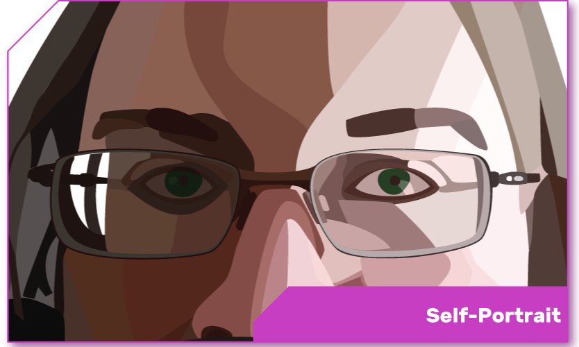 This self-portrait started as an exercise in choosing values to create the illusion of depth, and moved on from there to changing all the colors to grays while maintaining the effect. Finally, it came to resolving the image’s depth in a series of patterns created earlier, to maintain that same feeling of volume that the earlier images had.
